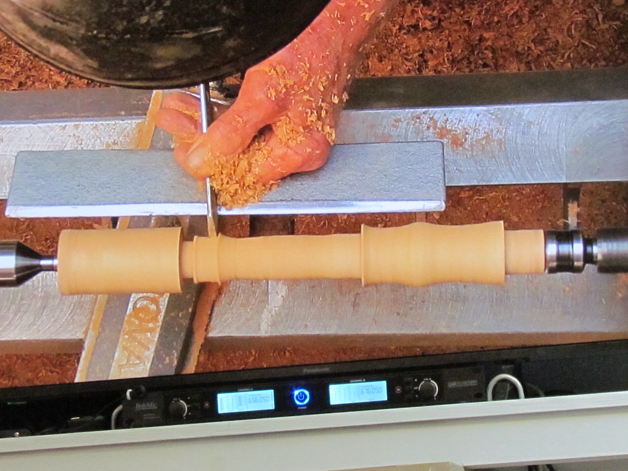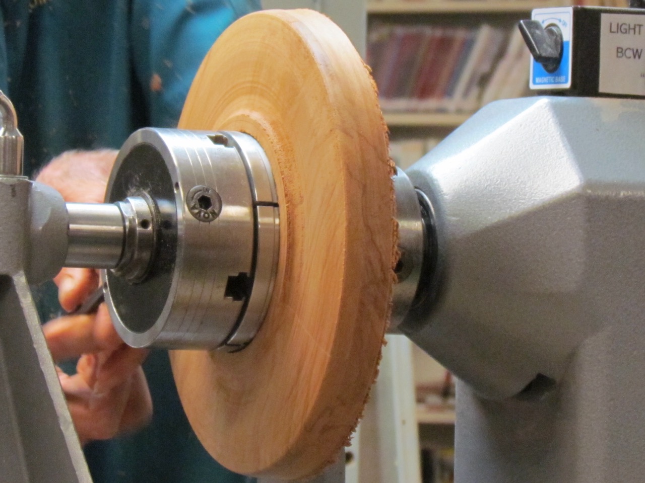 Jim started shaping up the first part of the mystery; a platter the with a central hole. Commenting on sharp tools, and the need for regular sharpening preparing the spigot for a large Titan 3 Chuck initially set up on the tailstock. The end product was still, a remaining mystery. However, Jim did allude to the fact that can be made with same or separate types of wood. The overall focus was as an exercise in making plates, possibly platters, which would, later, with measured centre hole added, be teacake platters.