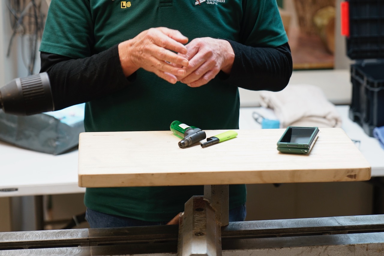 The many uses: discussion moved to how things, items and common material can be used to assist the construction and fitting process. Odell’s magic box bought out a whole range of very common items that can be used in other ways i.e., painting pyramids to hold things up. Old paint loads for use as a backdrop and used as mini containers. Lighters to make limited and restricted heat sources. Lighters to use for burning and sealing ends of lashings, necklaces, and jewelry fittings. More came out of the special box; lamps using USB chargers.